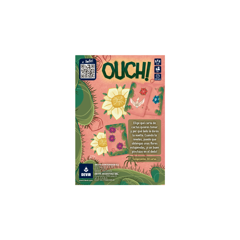 ¡Una aventura espinosa llena de diversión! OUCH! es un juego de cartas de velocidad y destreza donde los jugadores compiten por recolectar el mayor número de flores de cactus, pero con una regla: ¡evita los afilados pinchos! Para conseguir las flores, deberás tomar las cartas de los cactus con cuidado, girándolas para evitar el pinchazo. Un juego perfecto para los más pequeños, que fomenta la agilidad mental y la toma de decisiones.