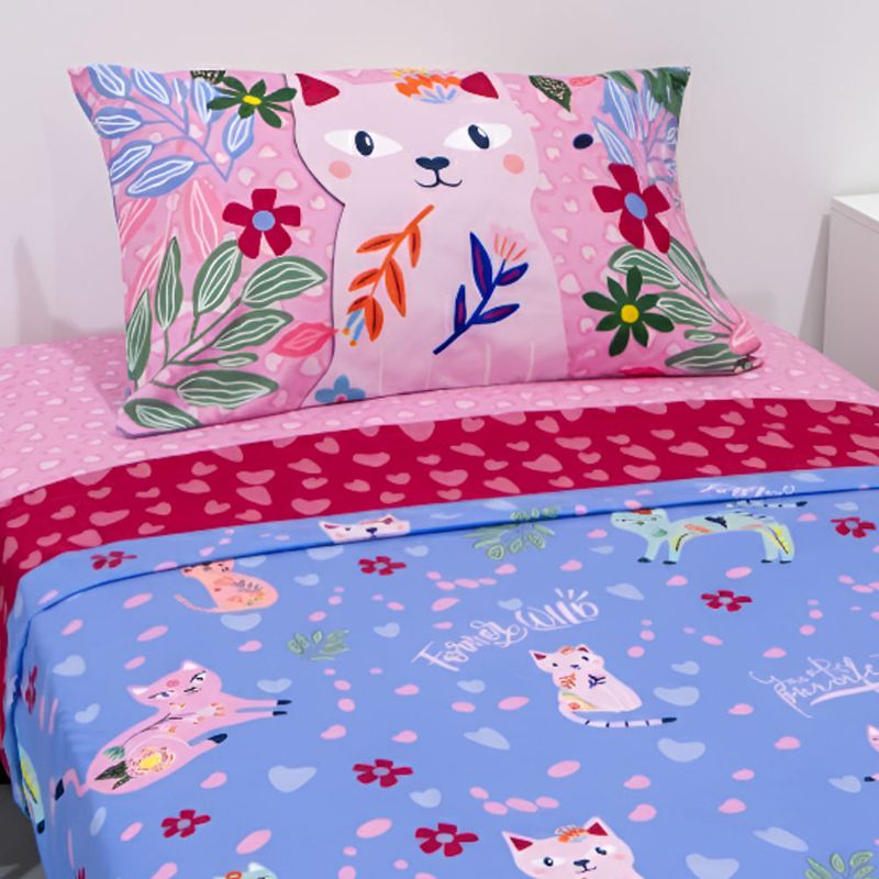 Llená su dormitorio de ternura, color y diversión con el Juego de Sábanas 1 ½ plaza WILD, un diseño encantador lleno de gatitos, corazones y detalles que inspiran dulzura. Ideal para niñas y preadolescentes que aman los colores vibrantes y los personajes tiernos.