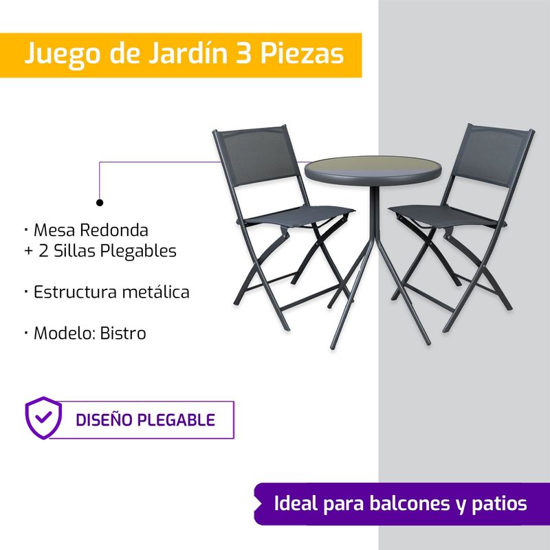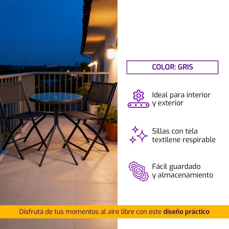 Incluye 1 mesa redonda y 2 sillas plegables, fabricadas en estructura metálica resistente con acabado pintado y superficie de tela textilene, lo que garantiza durabilidad, fácil limpieza y resistencia a la intemperie. (No apto bajo lluvia)