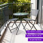 El set es plegable y compacto, lo que facilita su guardado y traslado cuando no está en uso. Su estilo minimalista combina fácilmente con diferentes tipos de decoración exterior.