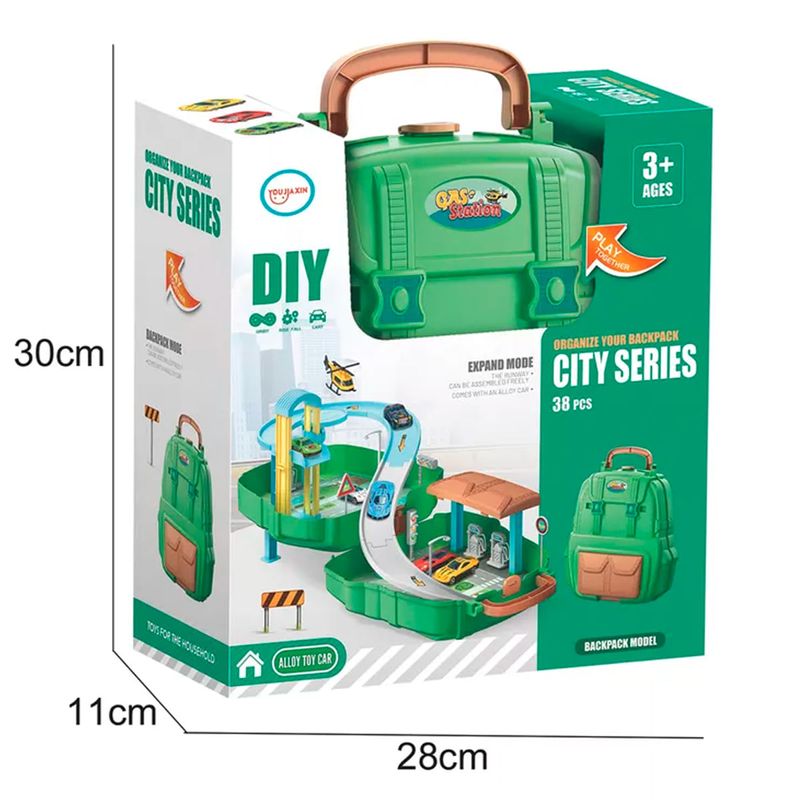 Características:- Diseño funcional: Mochila que también funciona como base para la pista de autos.