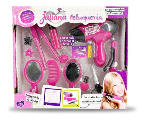 Juliana Set de peluquería con luz y sonido SISJUL025 Set super completo de Peluquería Juliana. Contenido: - Secador de pelo con sonido. - Planchita con luz - Buclera - Peine - Cepillo - Espejo - Tijera - Esmalte - Hebillas - Rimmel - Giftcard - Ficha de cliente.
