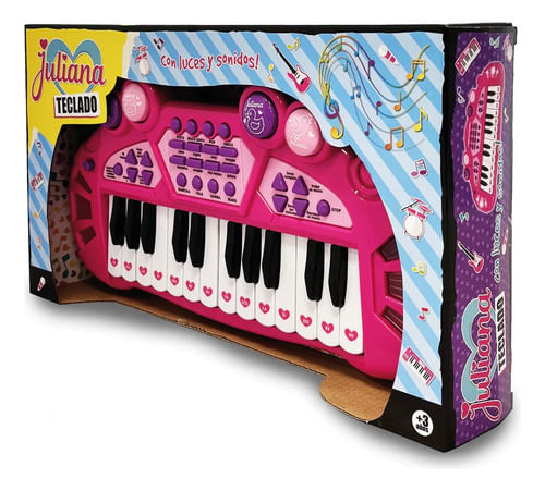 Juliana teclado con Luz y Sonido SISJUL063 Arma tu banda de rock con los instrumentos de Juliana Con el teclado de Juliana no vas a parar de divertirte, vas a poder tocar la música que te gusta con diferentes grabar y escuchar Teclas con notas musicales 8 Botones para cambiar el sonido de tu piano a diferentes instrumentos musicales 8 Botones con diferentes ritmos de acompañamiento Selector de volumen Botón de tempo para cambiar la velocidad en los diferentes ritmos Botón selector para escuchar 4 diferentes animales o instrumentos musicales Botón de stop Botón para cambiar y reproducir demos Botón para grabar y reproducir tus melodías Requiere 3 pilas AA (No incluidas)
