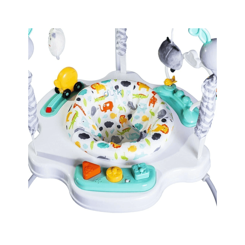 - Juguetes interactivos: La bandeja está llena de sorpresas, con juguetes colgantes, botones que activan sonidos y un piano interactivo para que tu bebé juegue mientras fortalece sus piernas.