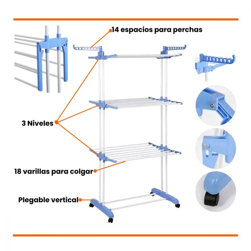 3 Niveles, 18 varillas para colgar y 14 espacios para perchas.