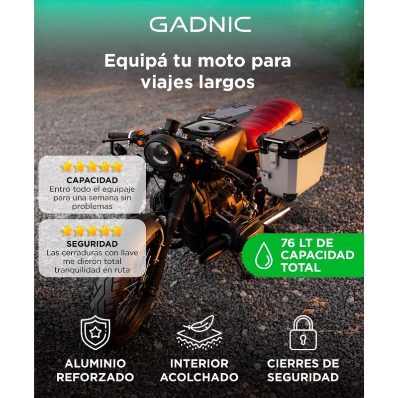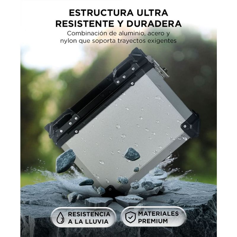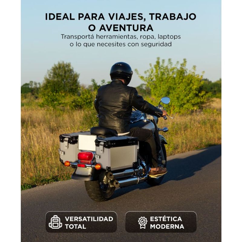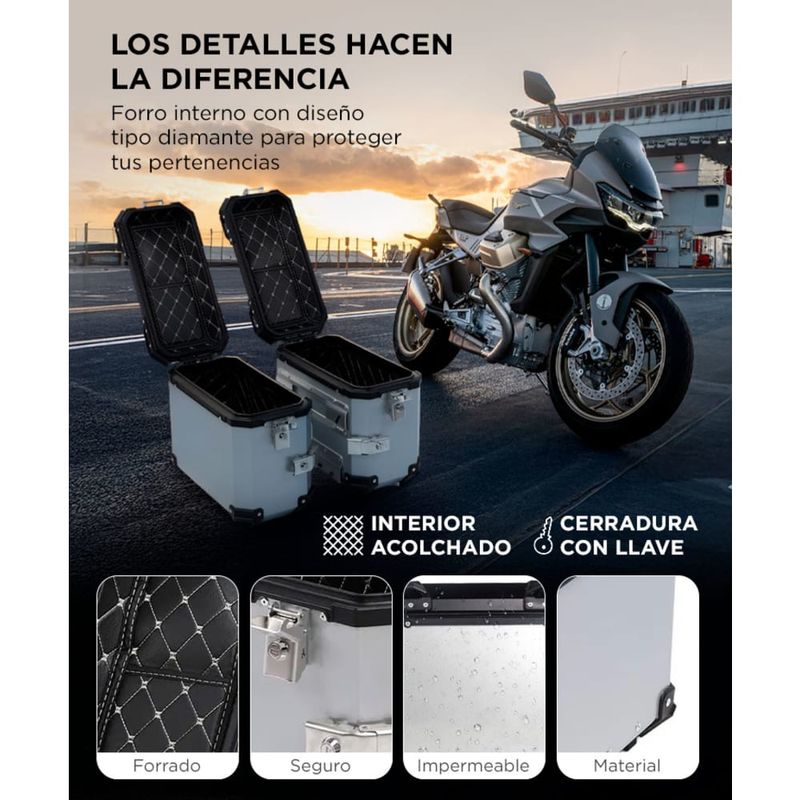 Cada baúl ofrece 38L, permitiéndote llevar todo lo necesario para trayectos largos o uso diario sin comprometer espacio.