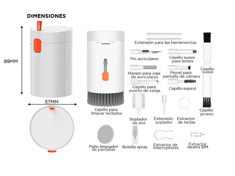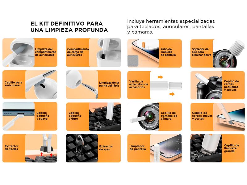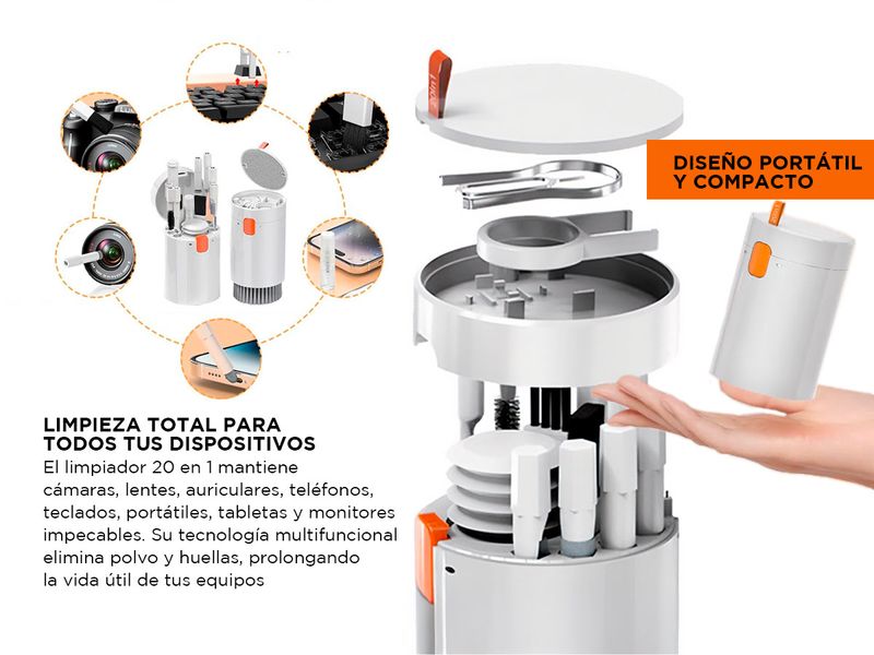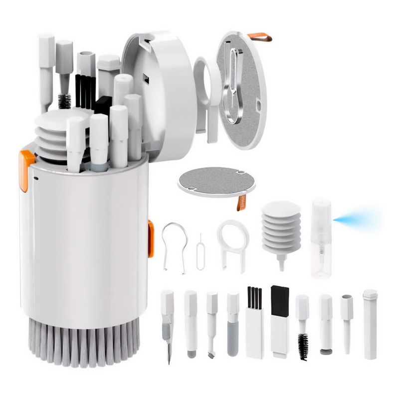 Mantené tus dispositivos impecables con este kit de limpieza 20 en 1, diseñado para cámaras, lentes, auriculares, teléfonos, teclados, portátiles, tabletas y monitores de PC. Su diseño ergonómico y herramientas especializadas garantizan una limpieza profunda y eficaz, eliminando polvo y suciedad sin dañar las superficies. Fabricado con materiales de alta calidad y resistencia, es portátil y compacto, ideal para llevar a cualquier lugar.