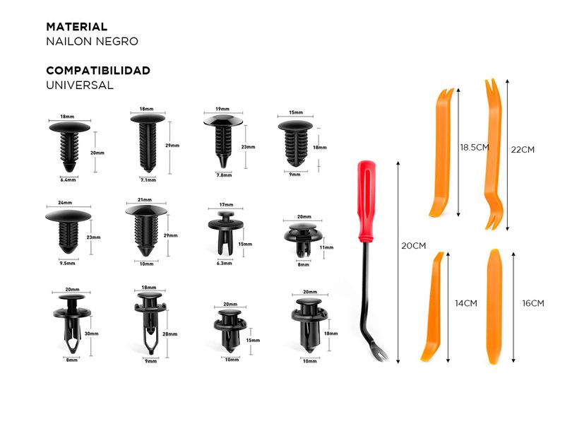 El kit incluye clips de retención a presión para automóvil, remaches de plástico y sujetadores, lo que lo hace ideal para reemplazar piezas que se han desgastado o se han roto. Además, todas las piezas están hechas de materiales de alta calidad que son duraderos y resistentes al desgaste.