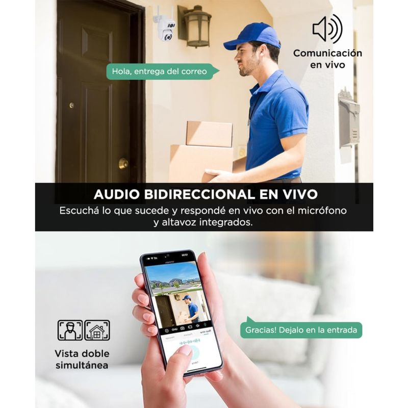 Gracias a su sistema de luces infrarrojas y LEDs blancos, mantiene una visión clara incluso en completa oscuridad. Podés alternar entre modo color, blanco y negro, o automático.