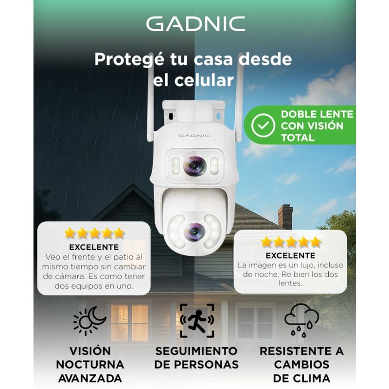 La cámara Gadnic Doble Lente 4K ofrece imágenes nítidas con dos sensores de 8 MP reales. Captura cada detalle en calidad 4K, ideal para proteger tu hogar o comercio con máxima claridad.