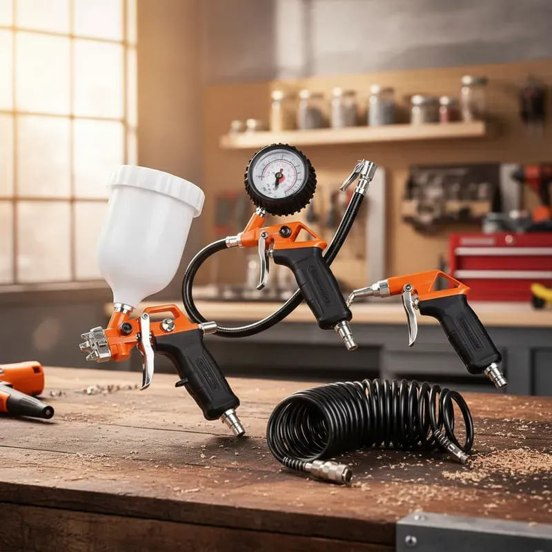 Completa y práctico kit de accesorios para tu compresor de aire, ideal para inflar, limpiar y trabajar con diversas herramientas neumáticas. Compatible con la mayoría de compresores domésticos y semiprofesionales