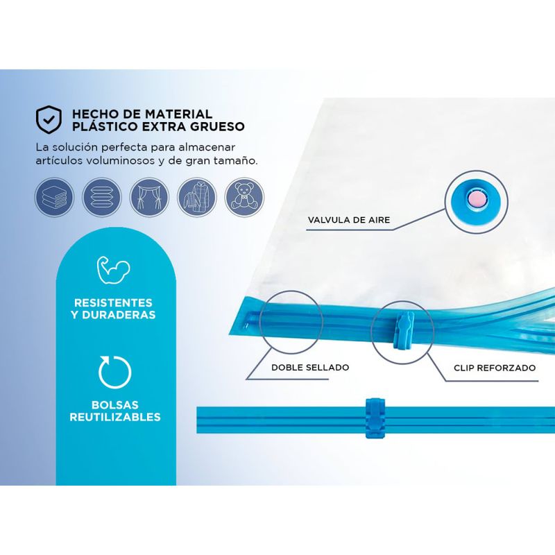Con cuatro bolsas de almacenamiento al vacío de alta calidad incluidas en varios tamaños, puede comprimir y proteger de manera eficiente una amplia gama de artículos, desde ropa de cama voluminosa hasta ropa de temporada. Dígale adiós a los armarios desordenados y a los cajones repletos mientras optimiza su espacio de almacenamiento con facilidad.