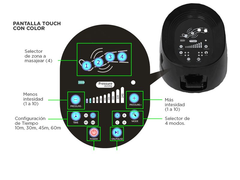 - Modo C: Las cámaras 1 y 2 se inflan y desinflan juntas, luego la cámaras 3 y 4 se inflan y desinflan juntas.