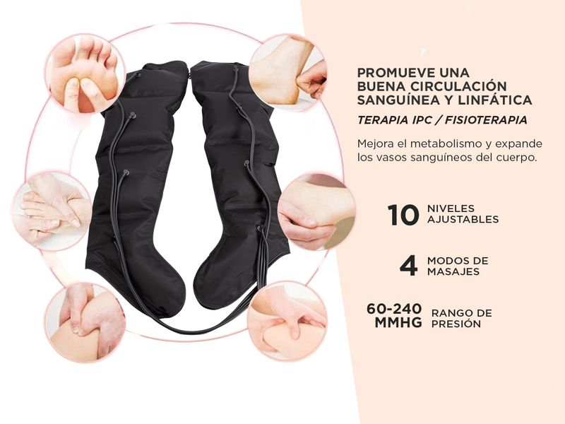 La botas de presoterapia se utilizan para producir masajes de compresión de aire para las piernas y la cintura. A través del inflado y desinflado secuencial e intermitente de las cámaras de aire, la terapia de compresión de aire es eficaz para promover una buena circulación sanguínea y linfática, mejorar el metabolismo y expandir los vasos sanguíneos del cuerpo. La terapia IPC como método de fisioterapia que es ampliamente adoptado por fisioterapeutas para realizar tratamientos para el alivio del edema linfático, la mala circulación sanguínea, la recuperación deportiva, la parálisis de las extremidades y el alivio del dolor de las extremidades.