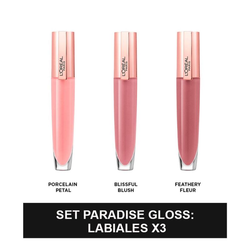Set incluye tres productos: 1 Paradise Gloss Porcelain Petal + 1 Paradise Gloss Blissful Blush + 1 Paradise Gloss Feathery Fleur.