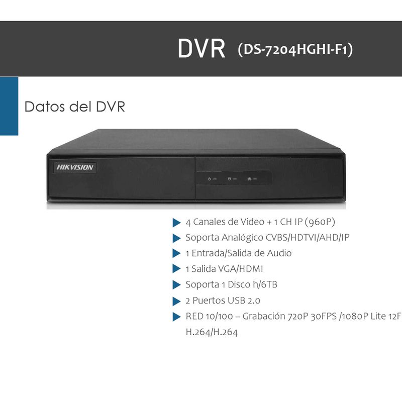 Kit DVR DS-7104HGHI-F1 + 4 CAMARAS DS-2CE56C0T-IRP + 1 FUENTE 12V 1A + 1 DIVISOR 1 A 4 PLUG UNIVERSAL + 1 STICKER PROPIEDAD MONITOREADA + 4 CABLES ARMADOS CCTV 20M