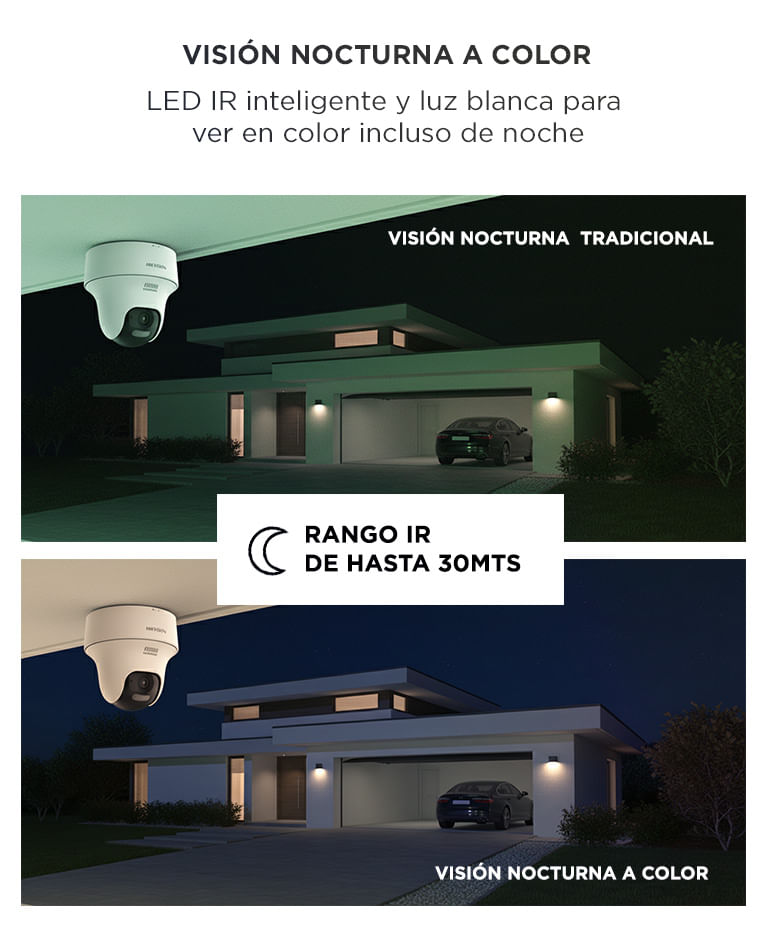 - Visión nocturna: IR inteligente + luz blanca