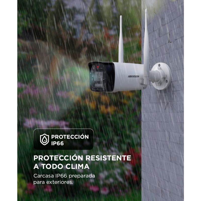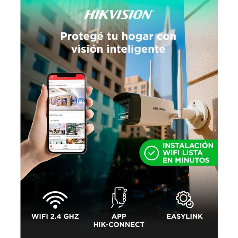 Cada cámara cuenta con micrófono y parlante integrados, permitiendo escuchar y hablar desde la app Hik-Connect. Podés ver video en vivo, reproducir grabaciones y recibir alertas por detección de movimiento directamente en tu celular.