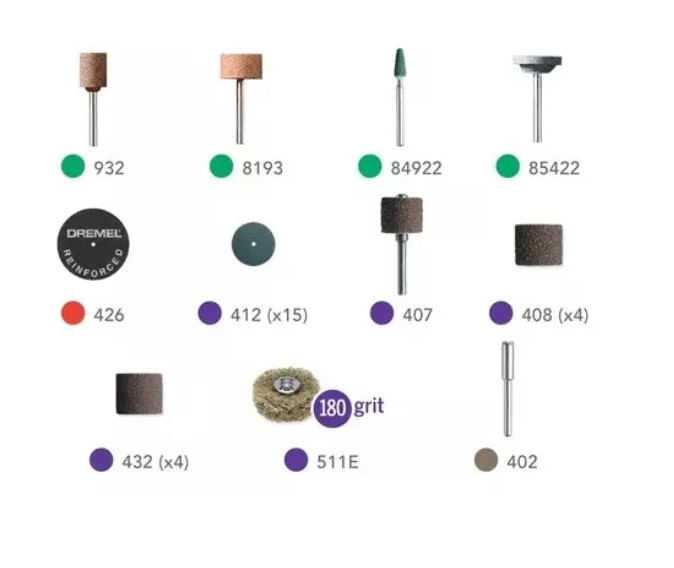 • El kit consta de piedras de esmerilado de óxido de aluminio, piedras de esmerilado de carburo de silicio, disco de corte reforzado con fibra de vidrio, discos de lijado, tubo de lijado, discos abrasivos de grano grueso para pulir, punta de grabado y esmerilado, bloqueo EZ y mandril.