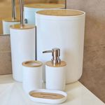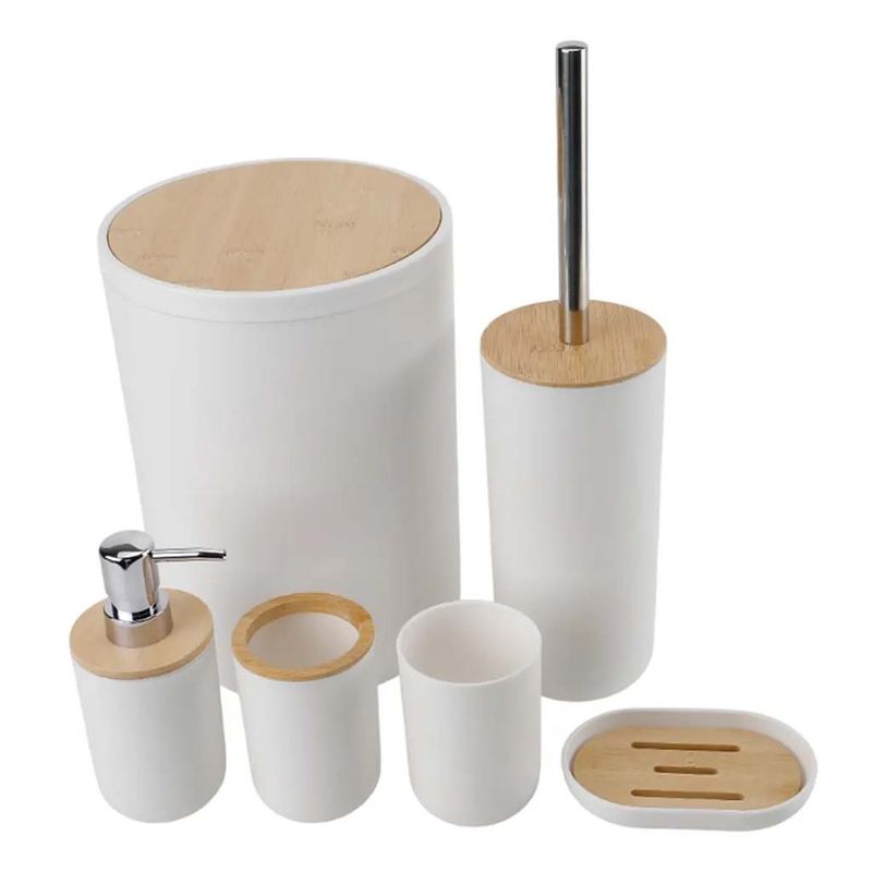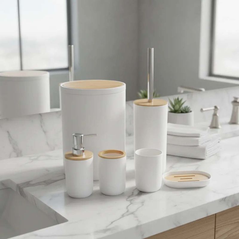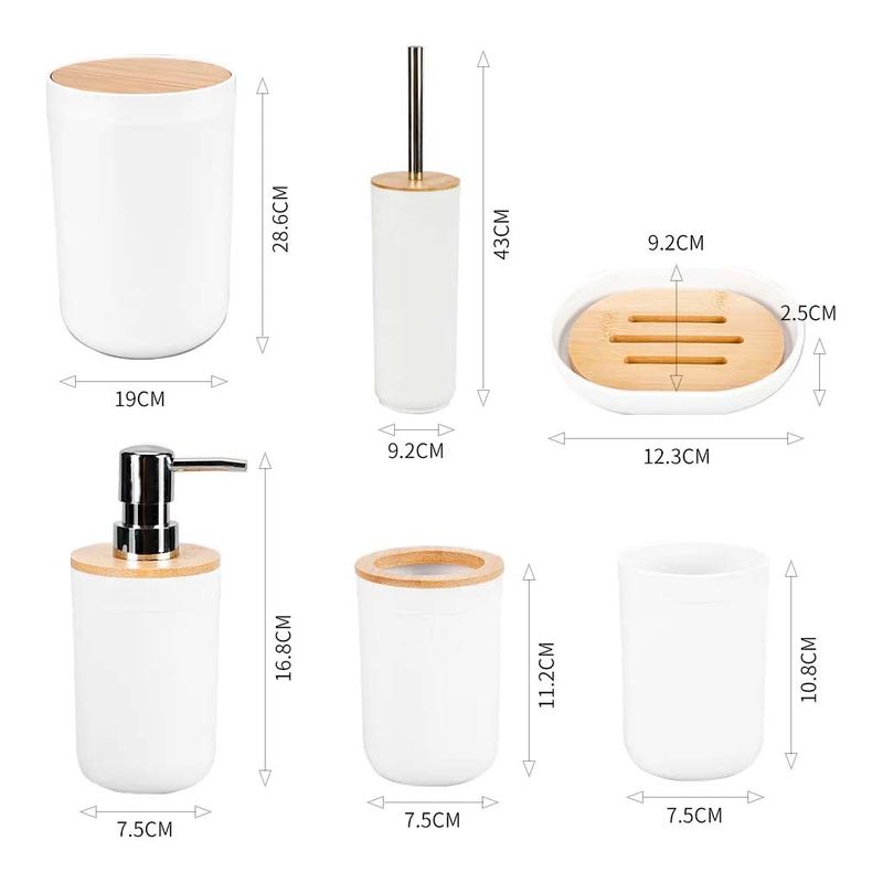 - Piezas incluidas: Cesto de basura, Dispenser De Jabón, Escobilla, Jabonera, Portacepillos, Vaso