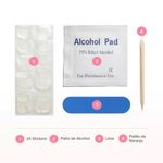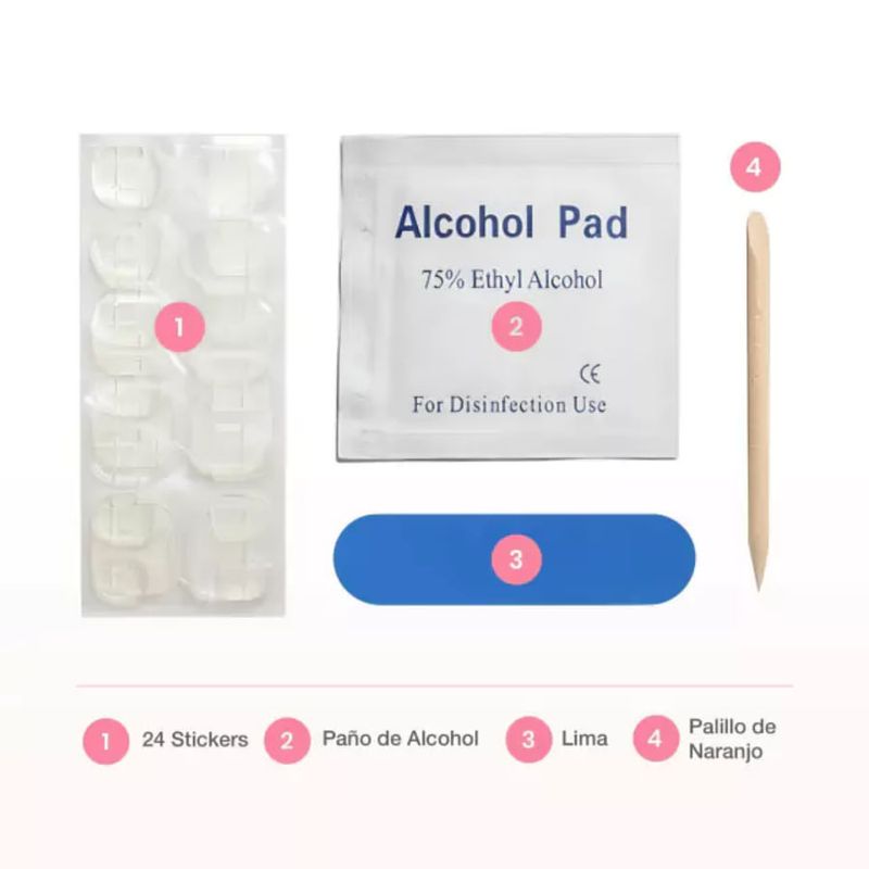 - El kit incluye: 24 uñas, 24 stickers, una lima, un paño de alcohol y un palillo de naranjo.