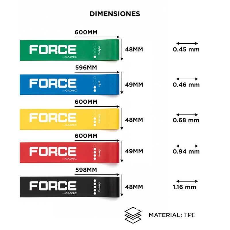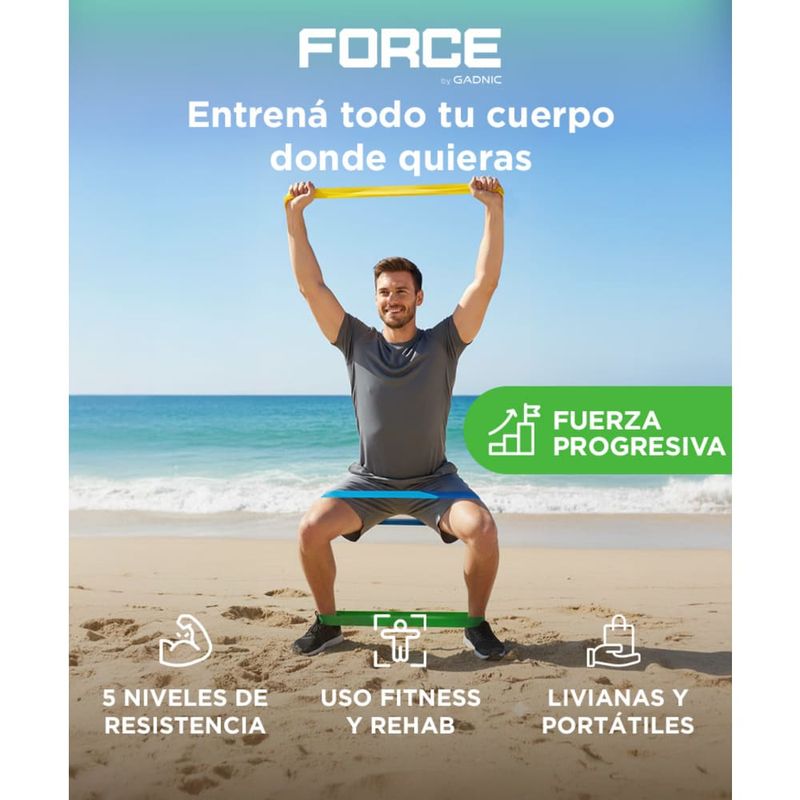 Las bandas elásticas Force by Gadnic FIT00009 permiten trabajar brazos, piernas, glúteos y core con una sola herramienta. Resultan adecuadas para rutinas de fuerza, movilidad y elongación tanto en casa como en gimnasio.