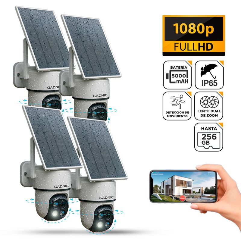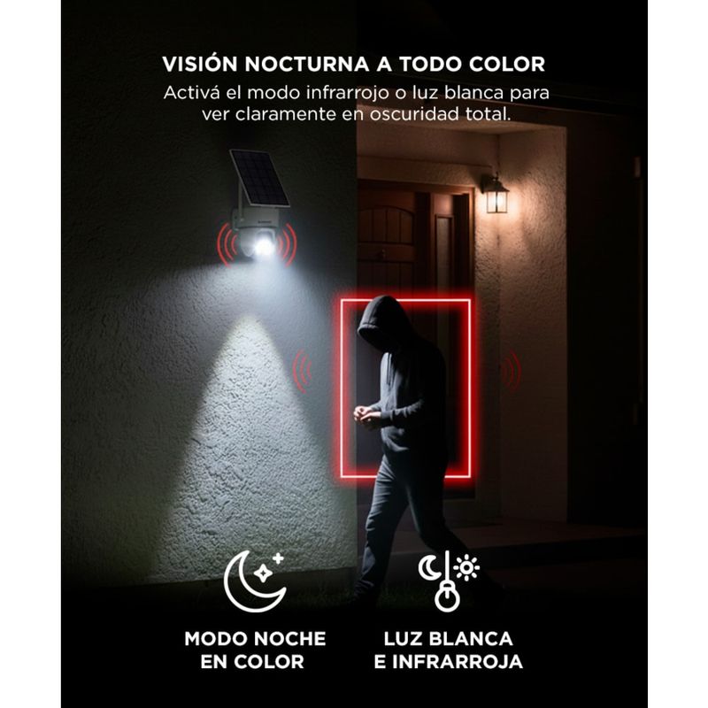 El panel solar incluido mantiene la cámara cargada todo el día, sin depender de enchufes ni instalaciones eléctricas.