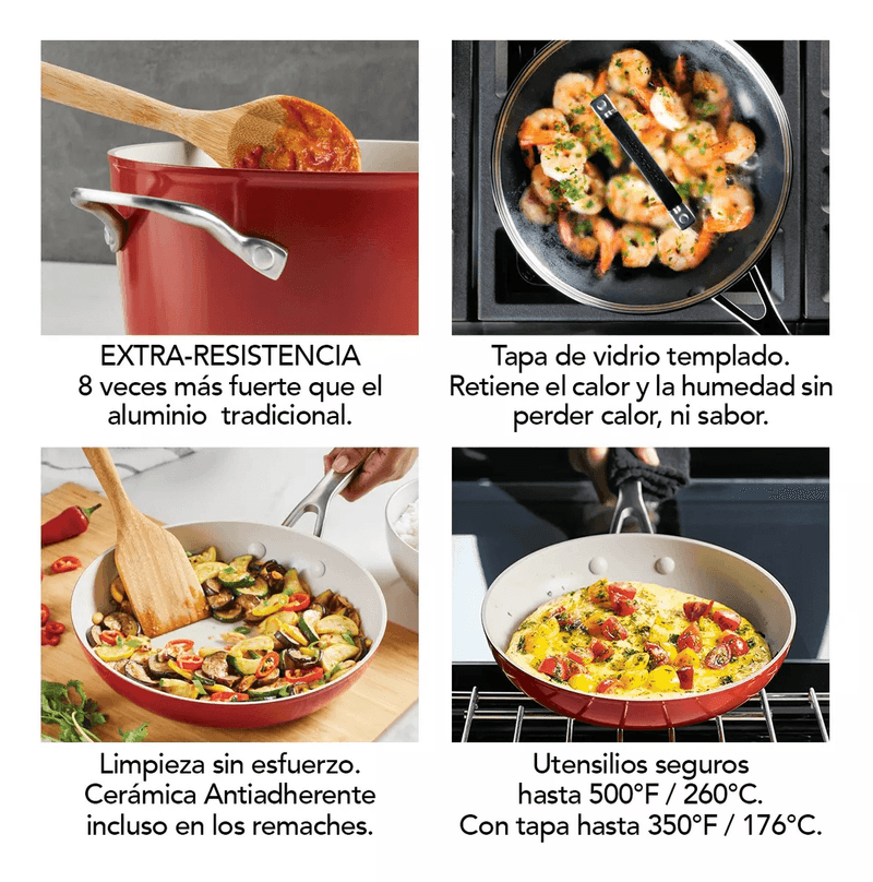 VERSATILIDAD amplía el repertorio de tus recetas pasando de la estufa al HORNO utensilios seguros hasta 500°F/ 260 °C , con tapa hasta 350° F/ 177°C