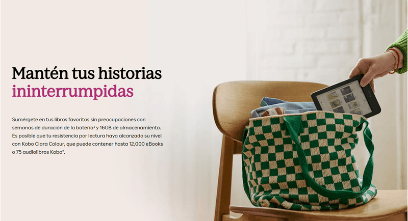 Sumérgete en tus libros favoritos sin preocupaciones, con semanas de duración de la batería y 16 GB de almacenamiento. Tal vez tu capacidad de lectura haya encontrado un desafío con Kobo Clara Colour, que puede guardar hasta 12 000 eBooks o 75 audiolibros Kobo.