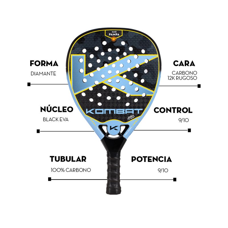 Pala de Pádel Kombat IA-63 PAMPA | Diamante 100% Carbono 12K Rugoso | Control 9/10 Potencia 9/10