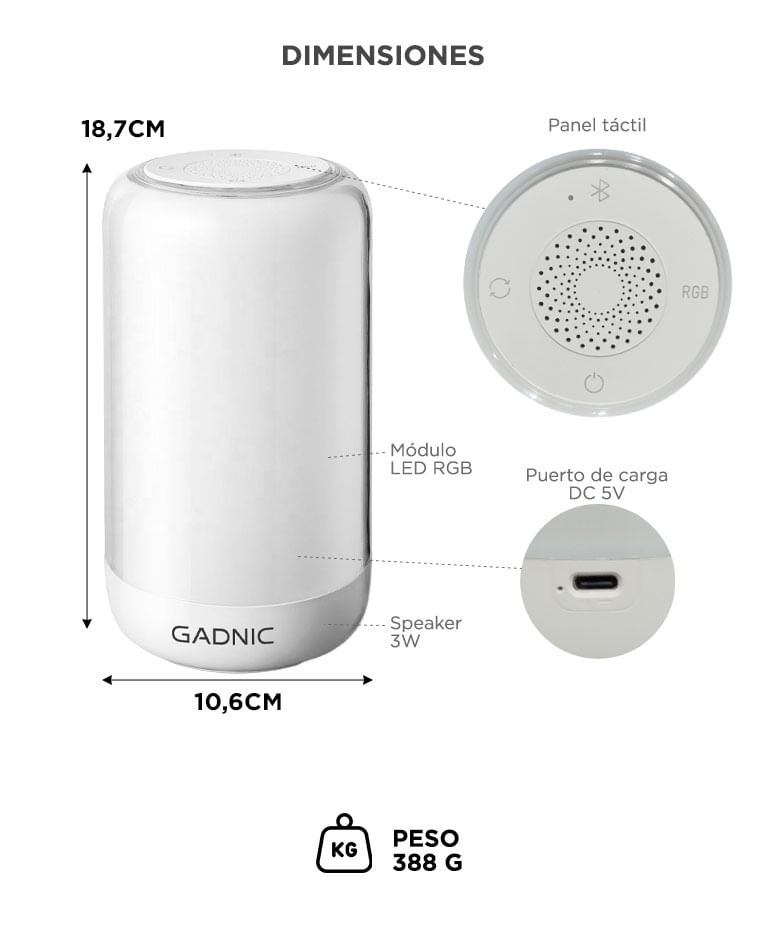 Fabricada en PC + ABS, combina resistencia y estética en un formato portátil. Su tamaño la hace perfecta para dormitorios, escritorios, livings y espacios de trabajo.