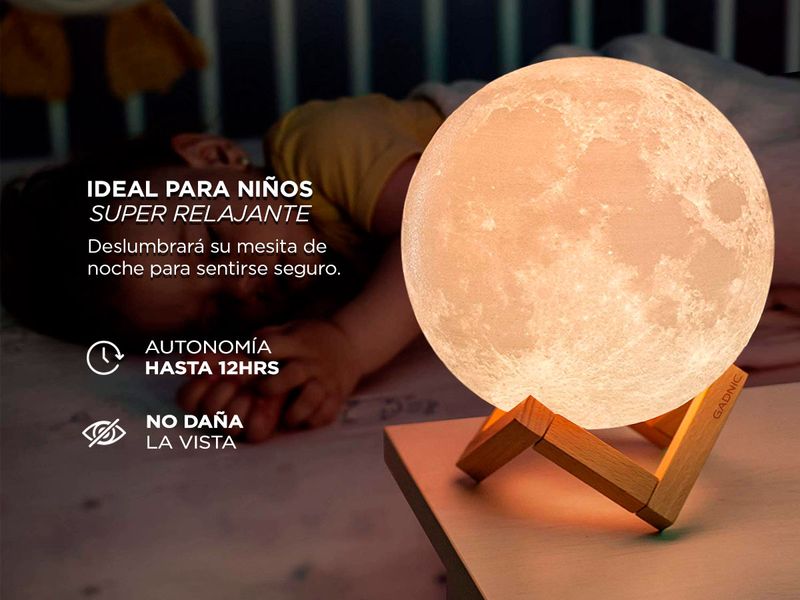 ¿Está buscando algo para agregar al estilo y la decoración de su hogar? ¿Algo que sea verdaderamente único y perfecto como punto focal? Nada encaja mejor que esta lámpara de luna 3D. Produce una luz blanca o amarilla cálida y fría y se puede colocar en cualquier lugar de su hogar. Utilizamos la última tecnología de impresión 3D para hacer esta lámpara lunar, dándole un aspecto y sensación de la vida real de una luna en miniatura. Le encantará tener éste velador en su casa. Su soporte de madera, batería recargable y 16 modos de luz la diferencia de todas las lámparas del mercado. Éstas lámparas eco-friendly son construidas con materiales biodegradables y sustentables.