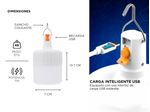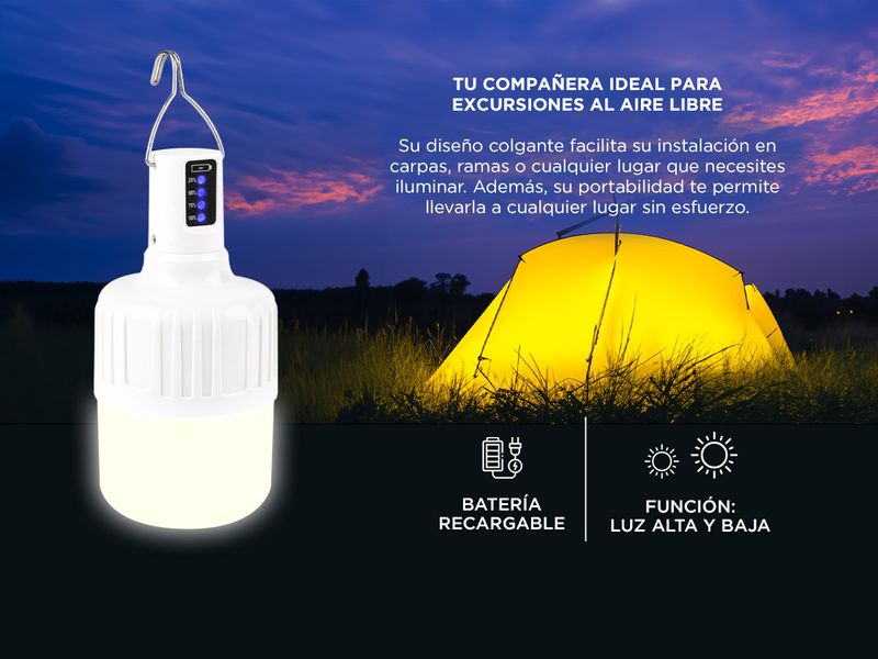 Su diseño colgante facilita su instalación en carpas, ramas o cualquier lugar que necesites iluminar. Además, su portabilidad te permite llevarla a cualquier lugar sin esfuerzo, agregando una luz acogedora donde sea necesario.