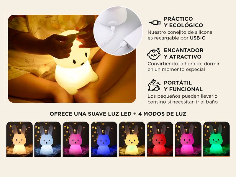 Nuestro conejito de silicona es recargable por USB-C, lo que lo hace práctico y ecológico. Ofrece una suave luz LED que es segura para los niños y ayuda a calmarlos en la oscuridad.