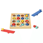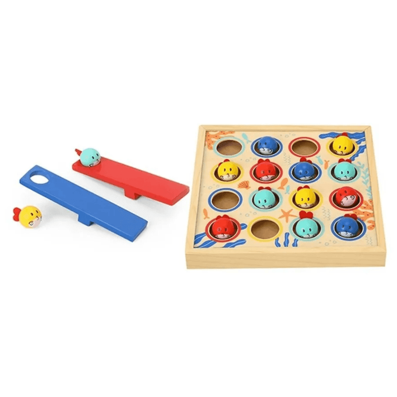 Los peces se reparten por igual y cada niño tiene que introducir sus peces, en el hueco del color correspondiente del tablero, por turnos. Si uno de los niños mete un pez en un hoyo de diferente color, se lo saca y es el turno del otro niño.