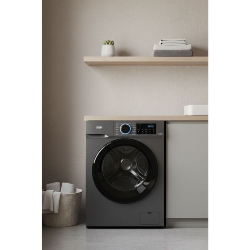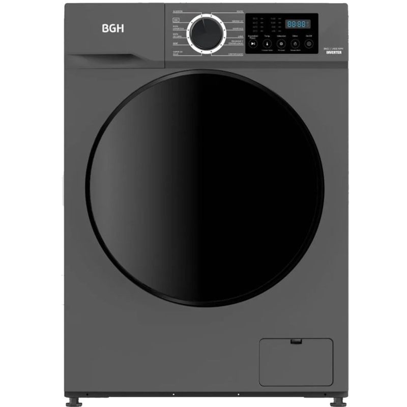 LAVARROPAS AUTOMATICO CARGA FRONTAL BWFE08S24AR INV 8K 1400 RPM GRIS BGH -Color DARK SILVER -Capacidad 8 kg -Tecnología Inverter -Velocidad de centrifugado max. 1400 rpm -Alimentación 220-240V ~ 50 Hz - Potencia máxima 1750 W - Potencia de calentamiento de agua (entrada) 1600 W - Potencia de lavado (entrada) 350 W - Potencia de centrifugado (entrada) 700 W - Clase de aislación eléctrica I - Clase de impermeabilidad IPX4 - Tipo de ficha eléctrica Ficha de 10A - Velocidades de centrifugado 0/400/800/1000/1400 rpm - Temperaturas de agua Frío/20/40/60/90? - Tamaño del tambor 60 Litros - Tipo de display LED - Presión admisible de agua 0,03-1 Mpa - Auto balanceo de carga - Reinicio automático por corte de luz - Bloqueo automático de puerta - Lavado inteligente - Detección de espuma y eliminación - Bloqueo para niños (bloquea el teclado) - Visualización de tiempo restante - Alarma de fin de programa -Cantidad de programas 12 programas: Algodón EEE Ropa deportiva Ropa de cama Bebé Vapor de agua Mixto Rápido 15' Sintético Lana Enjuague y Centrifugado Centrifugado - Programas especiales: Limpieza de tambor Pre lavado - Inicio programado De 3 a 24 horas - Clase de eficiencia A+++ - Consumo de energía 0,26 kWh/ciclo - Consumo de agua 40,0 L/ciclo - Capacidad del lavarropas 8,0 kg - Eficacia de centrifugado A - Duración del ciclo EE 228 min - Certificadora IRAM - Nº certificado SE DC-E-B31-367.1 (C1) - Nº certificado EE DC-E-B31-366.4 - Dimensiones de producto: Ancho 59,5 cm Profundidad 51,0 cm Alto 85,0 cm Peso neto 62 kg - Dimensiones caja: Ancho 65,2 cm Profundidad 57,1 cm Alto 88,5 cm Peso bruto 66 kg Factor de apilamiento (estiba) 3 - Modelo: BWFE08S24AR - Garantía: 12 meses - Origen: China