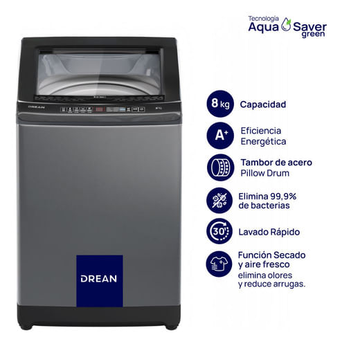 Lavarropas automático de carga superior. Su capacidad de lavado es de 8 Kg. Su velocidad de centrifugado es regulable hasta 660 RPM. Color gris. Eficiencia energética A+. Sistema de lavado oriental. 9 programas de lavado: ECO, Remojo, Lavado a mano, Algodón EEE, Acolchado, Delicado, Express, Satinizado y Para mañana. Display LED. ID System con ajuste de agua inteligente. Inicio diferido hasta 24 hs. Tambor de acero inoxidable con tecnología Pillow Drum y doble filtro atrapapelusa. Tapa de vidrio con cierre Soft Close. Función de secado y aire fresco. Alarma fin de lavado.