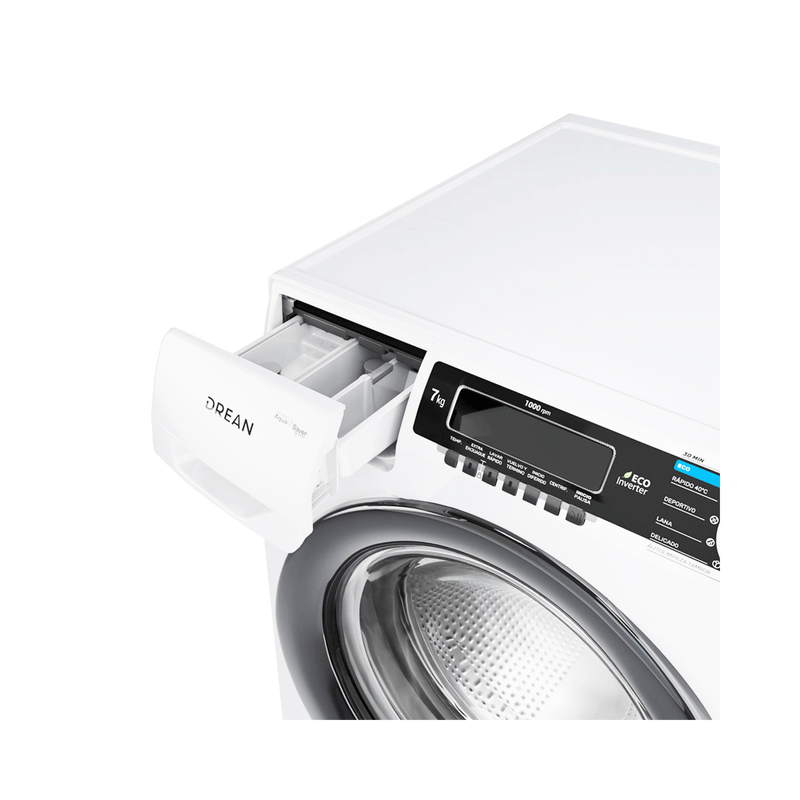 Su capacidad de lavado es de 7 Kg y su velocidad de centrifugado es regulable hasta 1000 RPM.