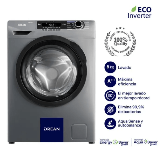 El Lavarropas Drean EcoInverter LCFDR0814SG0 de carga frontal combina una capacidad de 8 kg con un potente centrifugado de 1400 RPM, optimizando el consumo mediante su motor Inverter de eficiencia A+++ y sistema de carga autoadaptativa. Ofrece 13 programas de lavado especializados (incluyendo Rápido 30', Eco e Hipoalergénico) gestionados desde un intuitivo display LED con perilla retroiluminada, garantizando un manejo preciso y moderno. Su diseño robusto incorpora un tambor de acero inoxidable con tecnología de cuidado textil y cúpula de vidrio, sumando funciones avanzadas como inicio diferido, bloqueo para niños y autobalance para una operación segura y silenciosa.
