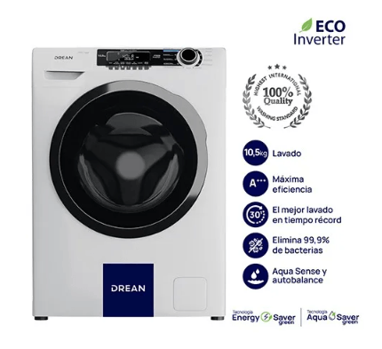 El nuevo Drean LCFDR1012SB0 representa lo último en innovación para el hogar, destacándose por su motor con Tecnología Eco Inverter. Este sistema no solo garantiza un rendimiento óptimo y una mayor durabilidad del equipo, sino que reduce significativamente el ruido y las vibraciones durante el funcionamiento. Gracias a su calificación de eficiencia A+++, este lavarropas logra un ahorro de hasta el 65% de energía, convirtiéndolo en una de las opciones más sustentables y económicas del mercado actual.