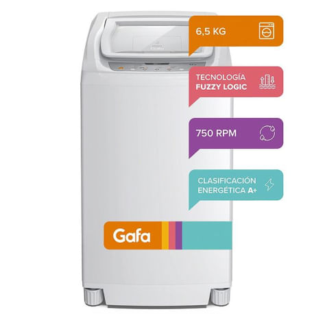 Lavarropas carga superior gafa digifit con capacidad de lavado de 6.5 kg, automatico,4 programas, 760 RPM en el centrifugado, control de temperatura, carga auto adaptativa, eficiencia energética A+ y en el centrifugado B, cuenta con filtro de pelusas con tecnología nano cobre, elimina e inhibe hasta el 99% de las bacterias acumuladas en el filtro, tambor de acero inoxidable común moderno hexagonal hexa drum.Lavado FuzzyEl lavado Fuzzy en un lavarropas es un sistema inteligente que ajusta automáticamente los parámetros del ciclo de lavado, como el nivel de agua, tiempo y detergente, según la cantidad de ropa, el tipo de tejido y el nivel de suciedad. Este sistema optimiza el consumo de recursos y asegura un lavado eficiente y cuidadoso.