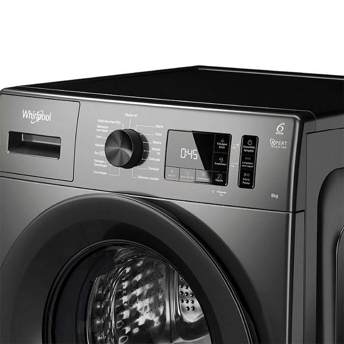 El lavarropas de carga frontal Whirlpool de 8 kg y 1200 RPM incluye un motor Xpert Inverter, que garantiza ahorro de energía, alto rendimiento y durabilidad. Con tecnología **6to Sentido**, optimiza los ciclos mediante sensores inteligentes que detectan la carga, ahorrando hasta un 40% de agua y energía. Además, sus funciones con vapor cuidan las prendas y mejoran los resultados de lavado.InverterLa función inverter en un lavarropas optimiza el rendimiento del motor al ajustar su velocidad de forma precisa según la carga y el programa seleccionado. Esto reduce el consumo de energía, disminuye el ruido y prolonga la vida útil del motor, ofreciendo un lavado más eficiente y silencioso. Ideal para quienes buscan mayor ahorro y cuidado en su hogar.FreshCare+La función FreshCare+ en los lavarropas Whirlpool mantiene las prendas frescas dentro del tambor después de finalizar el ciclo de lavado. Utiliza un suave movimiento del tambor combinado con vapor para: Prevenir malos olores, Reducir arrugas, Cuidar las prendas, Cuidar las prendas. Es ideal para quienes no pueden retirar la ropa inmediatamente después del lavado.