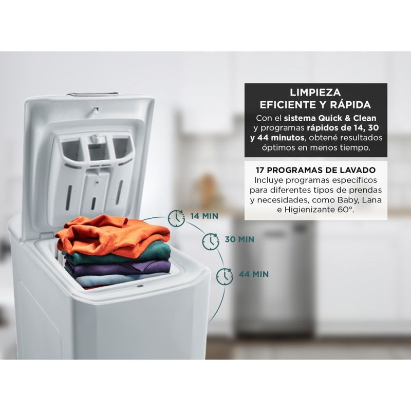 Gracias al sistema Quick & Clean, este lavarropas inyecta una mezcla concentrada de agua y detergente directamente en los tejidos, logrando una limpieza profunda en menos tiempo. El programa Perfect Rapid 59' te permite obtener resultados óptimos en menos de una hora.