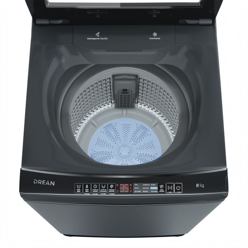 Lavarropas automático de carga superior. Capacidad de 8 Kg. Color gris. Velocidad hasta 660 RPM. Eficiencia A+. Sistema de lavado oriental. 9 programas. Display LED. Inicio diferido. Bloqueo para niños. Tambor de acero inoxidable. Ajuste inteligente de agua. Tapa de vidrio con cierre Soft Close.