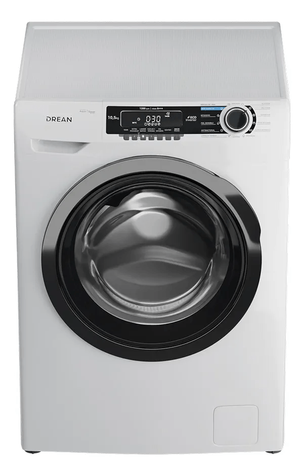 Lavarropas de carga frontal con tecnología Ecoinverter. Su capacidad de lavado es de 10,5 Kg y su velocidad de centrifugado regulable hasta 1200 RPM. Color blanco. Eficiencia energética A+++. Lavado europeo. 13 programas de lavado. Display LED y perilla retroiluminada. Carga autoadaptativa y función autobalance. Tambor de acero inoxidable con luz. Cúpula de vidrio. Sus programas incluyen lavado rápido 30’, ECO, hipoalergénico. Opción vuelvo y termino, inicio diferido y extra enjuague.