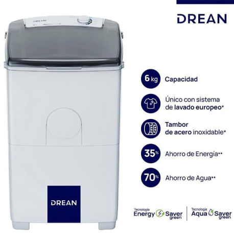 El Lavarropas Semiautomático Drean LTDR67SB0 es un electrodoméstico de carga superior con una capacidad de lavado de 6 kg y un tambor de acero inoxidable. Cuenta con 7 programas de lavado: Eco, Sintético, Algodón, Color, Intensivo, Delicado y Enjuague. Su diseño incluye una tapa transparente que permite visualizar el proceso de lavado. El sistema de lavado europeo garantiza un cuidado superior de las prendas, simulando el lavado a mano para mantener la suavidad y los colores. El comando superior con perilla facilita la selección de programas de manera sencilla e intuitiva. El dispenser de detergente y suavizante asegura una dosificación adecuada de los productos de limpieza.?Sistema de lavado europeoEste sistema reproduce movimientos similares al lavado manual, proporcionando una limpieza profunda y cuidando los tejidos para mantener la calidad de las prendas7 programas de lavadoOfrece una variedad de opciones adaptadas a diferentes tipos de tejidos y niveles de suciedad, permitiendo seleccionar el programa más adecuado para cada necesidad.Tambor de acero inoxidableTambor de acero inoxidable