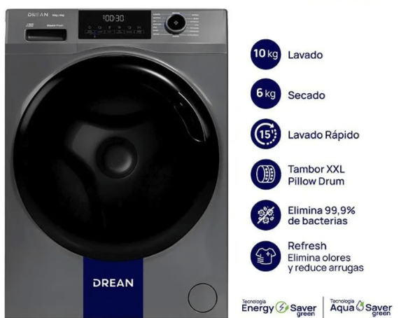 El Lavarropas Drean LSCDR1006SG con tecnología Inverter combina lavado y secado en un solo equipo, optimizando espacio y tiempo. Su capacidad de 10 kg de lavado y 6 kg de secado permite lavar grandes volúmenes de ropa en una sola carga. Su diseño moderno en color gris con panel digital intuitivo facilita la selección de programas específicos según el tipo de tela. Además, su motor Inverter reduce el consumo energético, prolonga la vida útil del equipo y minimiza el ruido durante el funcionamiento.