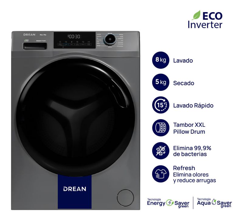 Lavasecarropas Carga Frontal Ecoinverter 8 Kg Gris Drean LSCDR0805SG0
