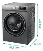 La pantalla integrada permite un manejo intuitivo y sencillo, brindando acceso rápido a todas las funciones y programas disponibles. Con dimensiones de 84.5 cm de altura, 59.5 cm de ancho y 61 cm de profundidad, este lavasecarropas se adapta a espacios reducidos sin sacrificar su capacidad. Su diseño robusto, con un peso de 70 kg, asegura durabilidad y estabilidad durante su uso.