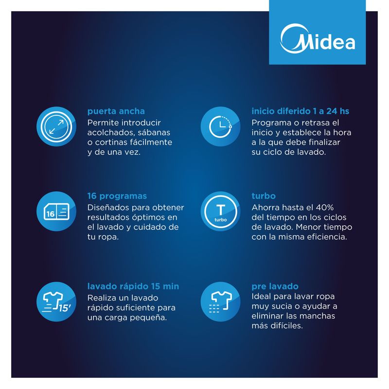 El Lavasecarropas Midea 8/6kg es la solución ideal para lavar y secar en un solo equipo. Con 8 kg de lavado y 6 kg de secado, se adapta perfecto a familias o cargas diarias, cuidando tus prendas y ahorrando espacio en casa.